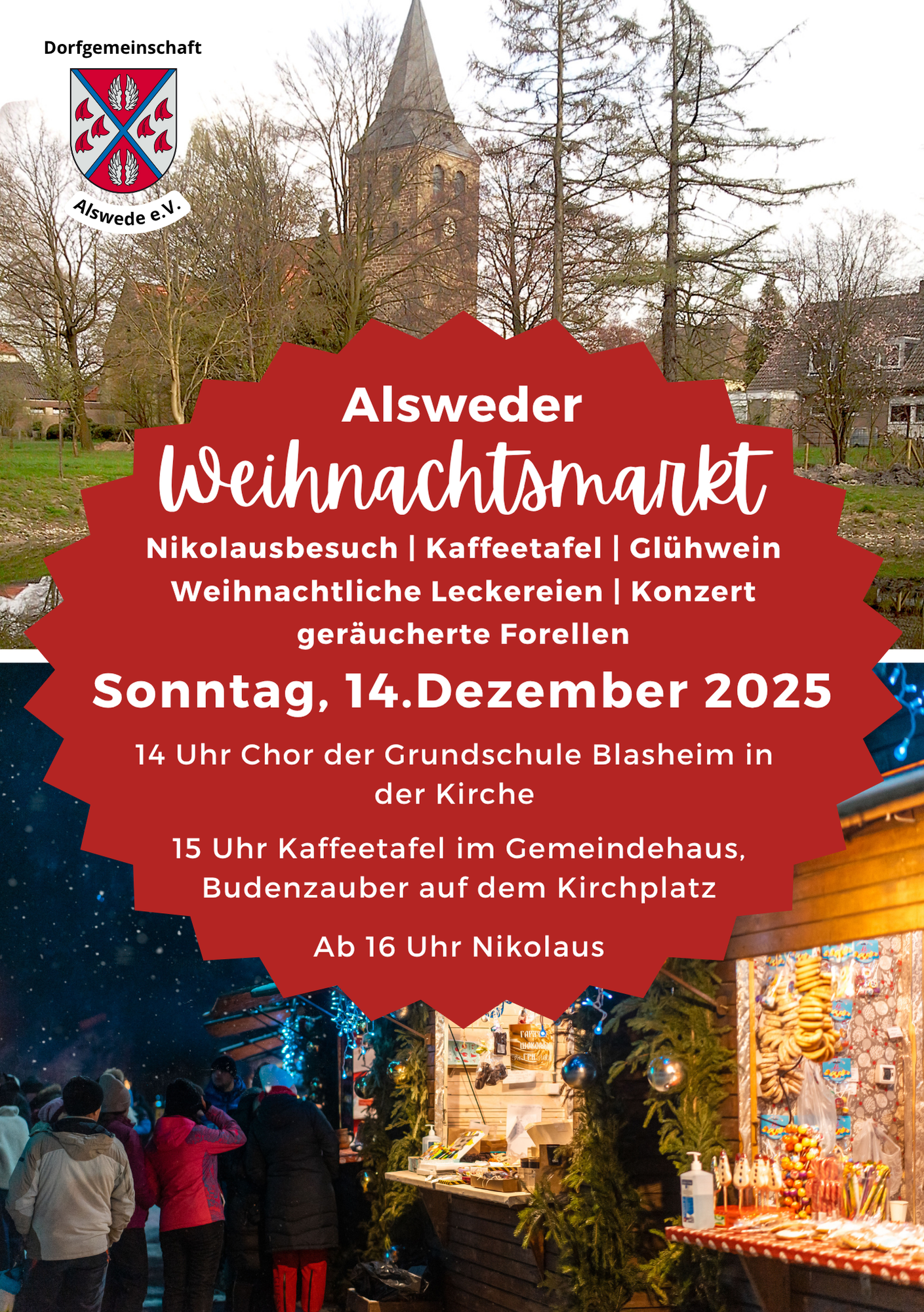 Am dritten Advent, Sonnatag, den 14.Dezember 2025, findet der Alsweder Weihnachtmarkt statt.