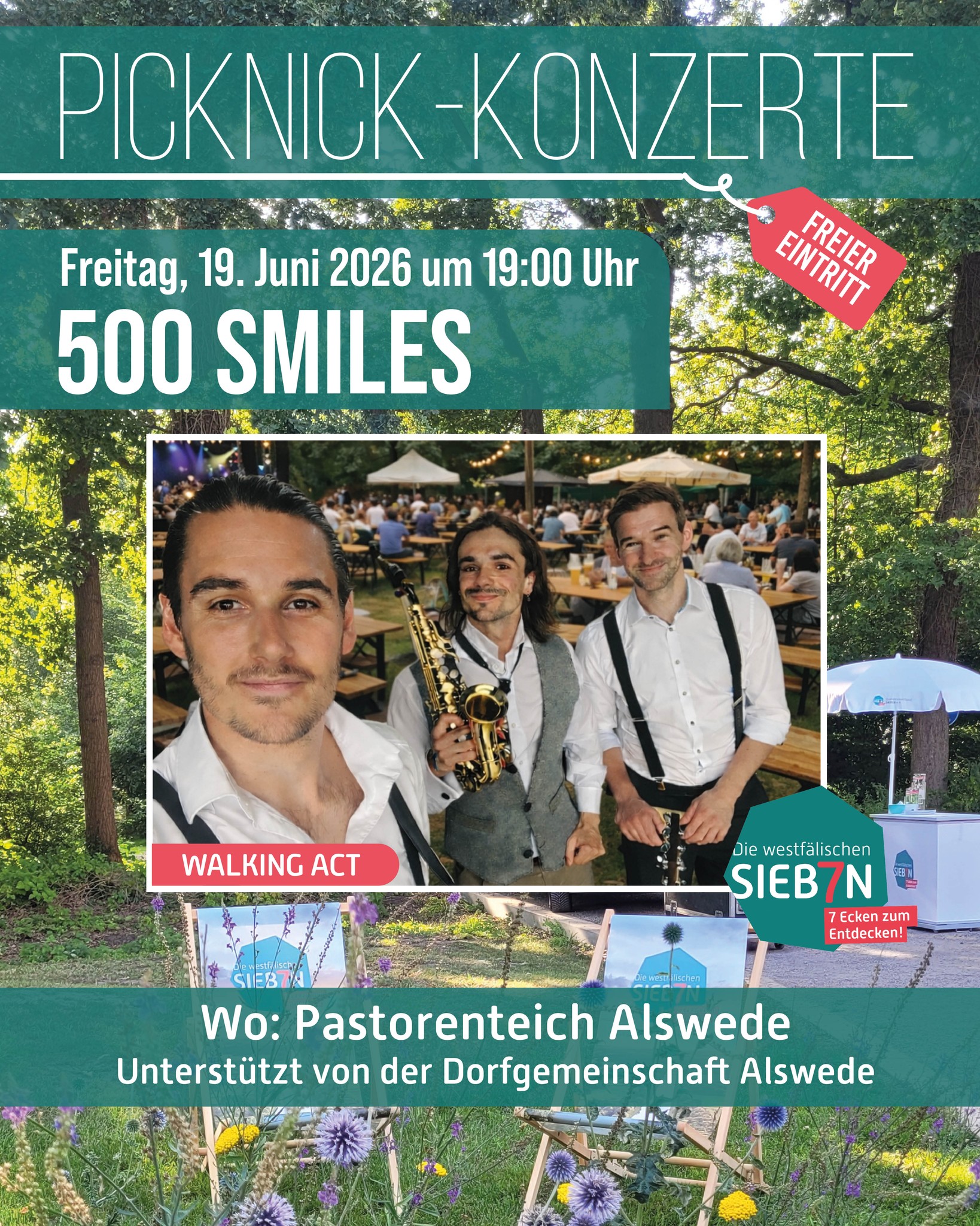 Picknick-Konzert der westfälischen Sieben mit der Band "500 Smiles". Eintritt frei.